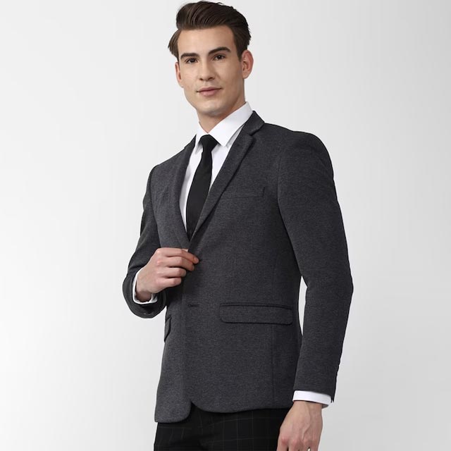Grey solid slim-fit blazer, has a notched lapel collar, single-breasted with double button closures, long sleeves, 3 pocket, three internal pockets, and a double-vented back hem.