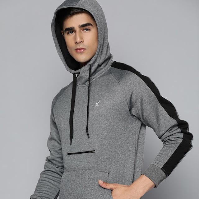 Charcoal grey solid sweatshirt has a hood, 1 kangaroo pocket, long sleeves, zip detail, ribbed hem