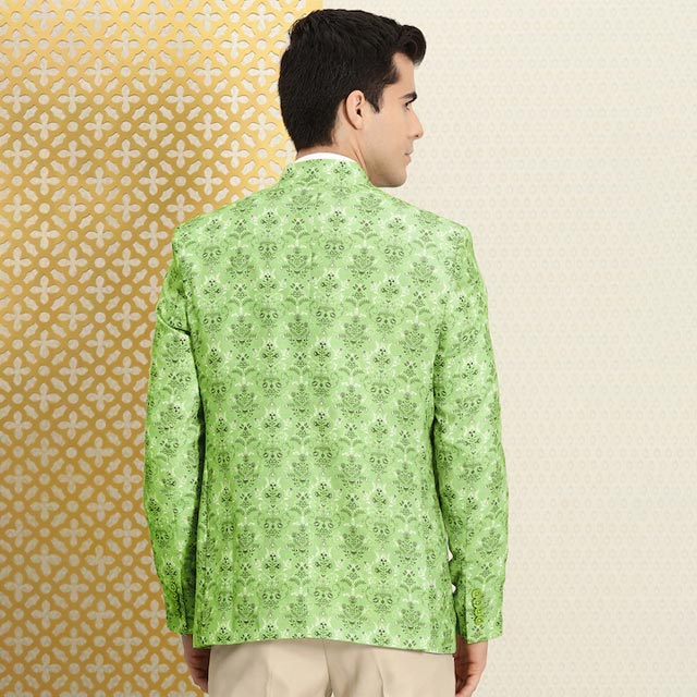 Lime green ethnic motifs printed blazer, has a mandarin collar, bandhgala with full placket button closure, long sleeves, two patch pockets, double vented back hem, attached lining with two welt pockets