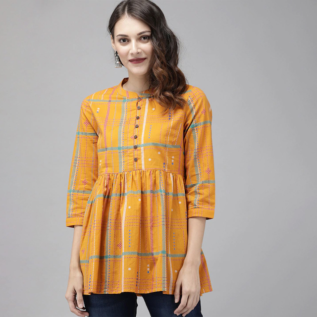 Yellow and Green checked woven regular top, has a mandarin collar, and three-quarter sleeves